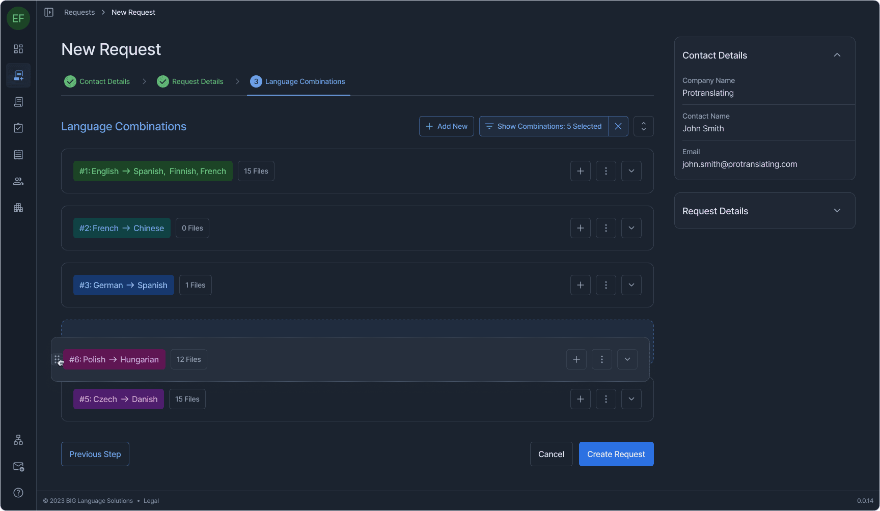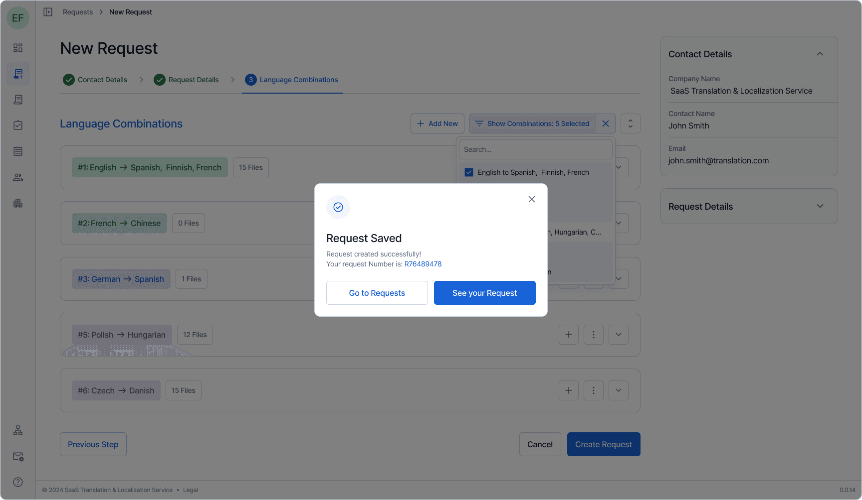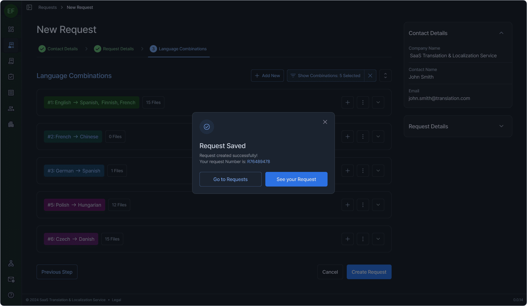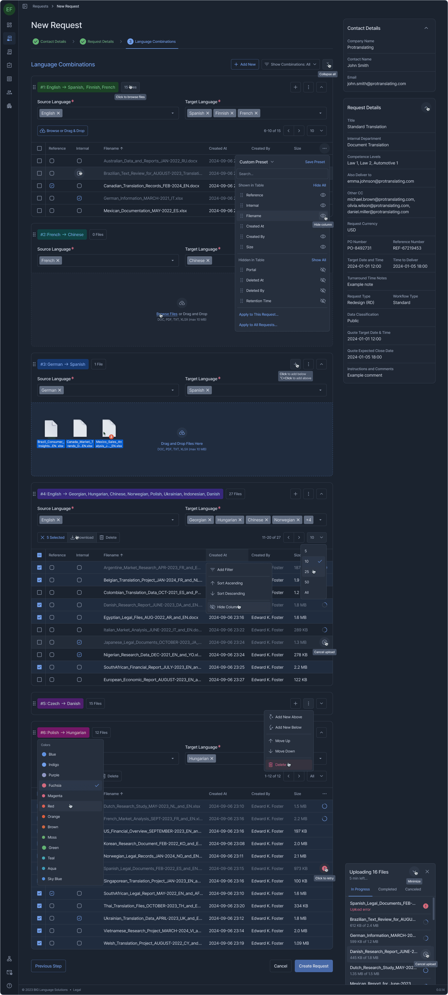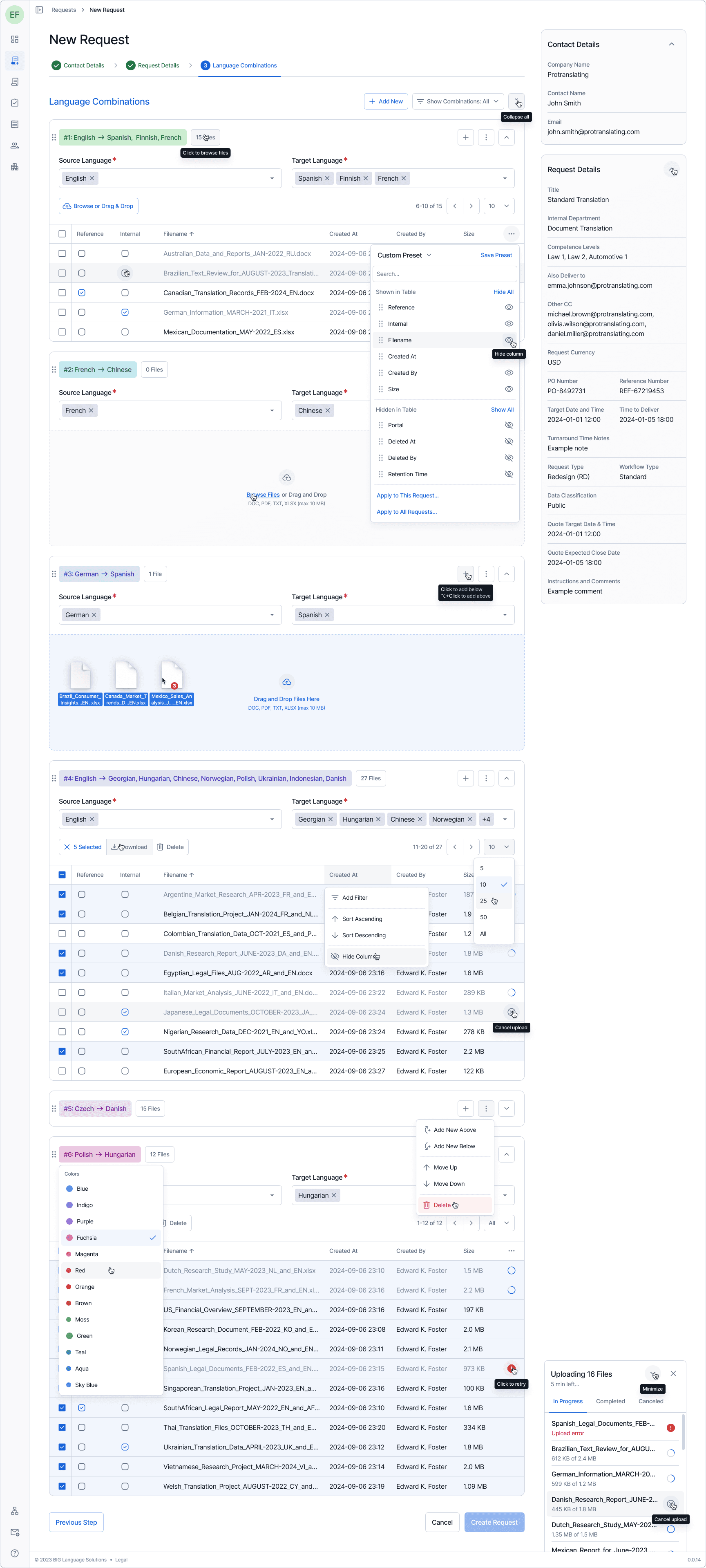 One example: translation requests can involve multiple language pairs, each with its own file set, metadata, and status. The new request flow uses a stepped wizard with a persistent context sidebar, language combinations that expand and collapse independently, inline file management, and bulk operations — all within a single coherent view. Every other section followed the same logic: surface what matters, let the user drill deeper on demand, never hide context