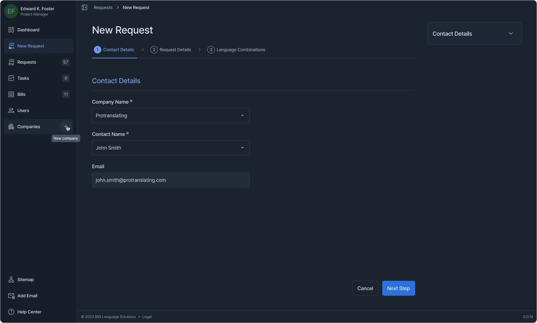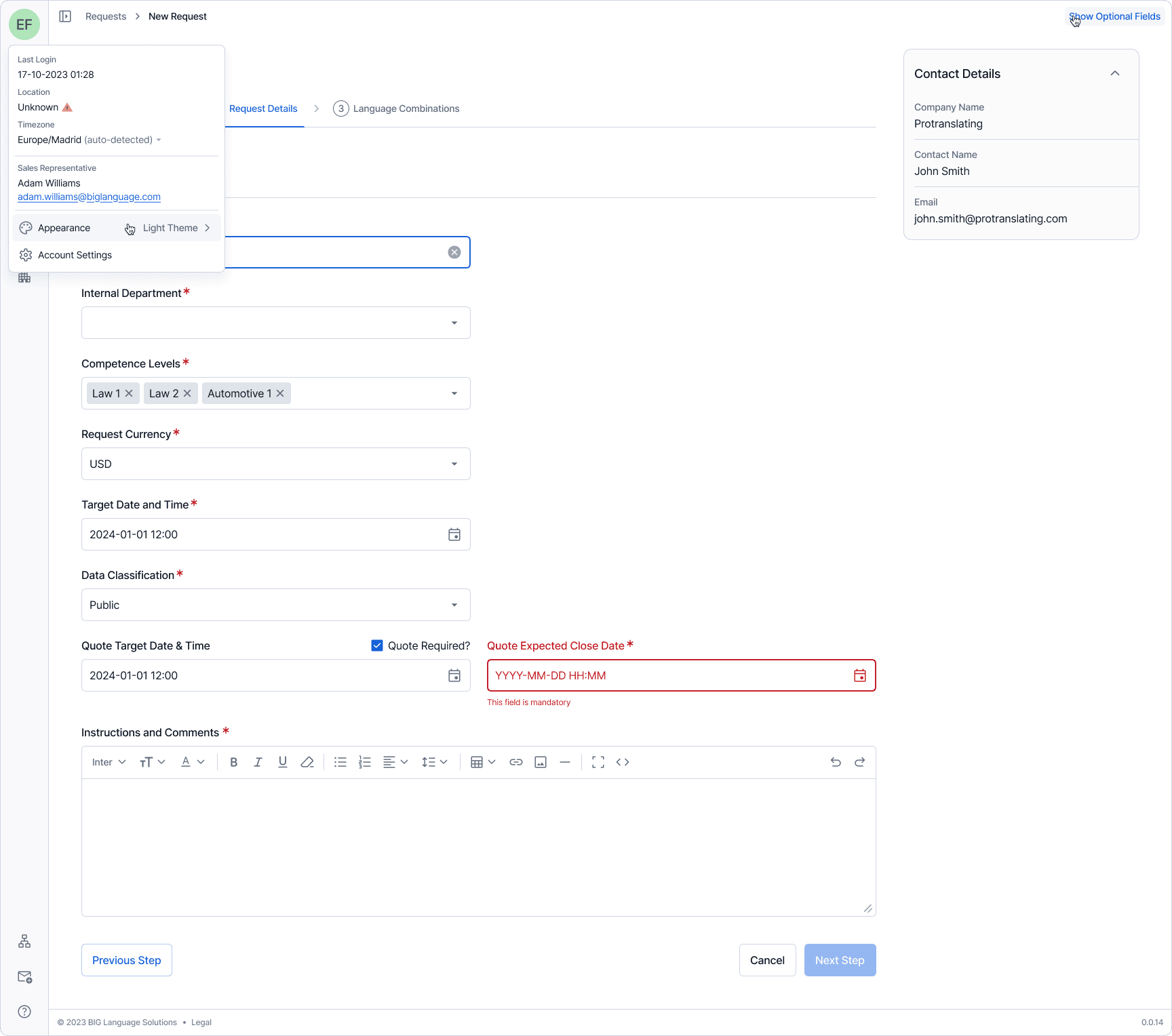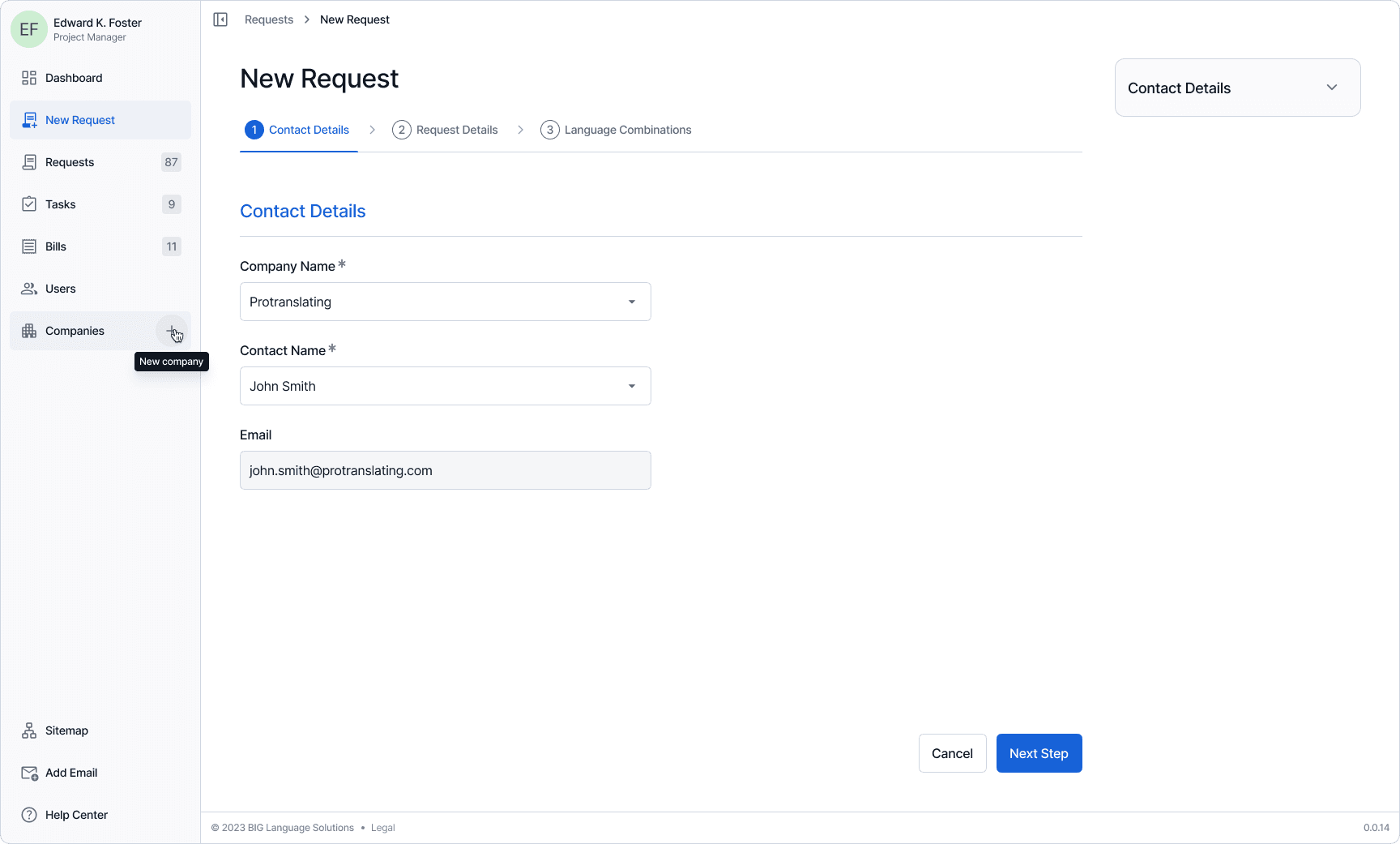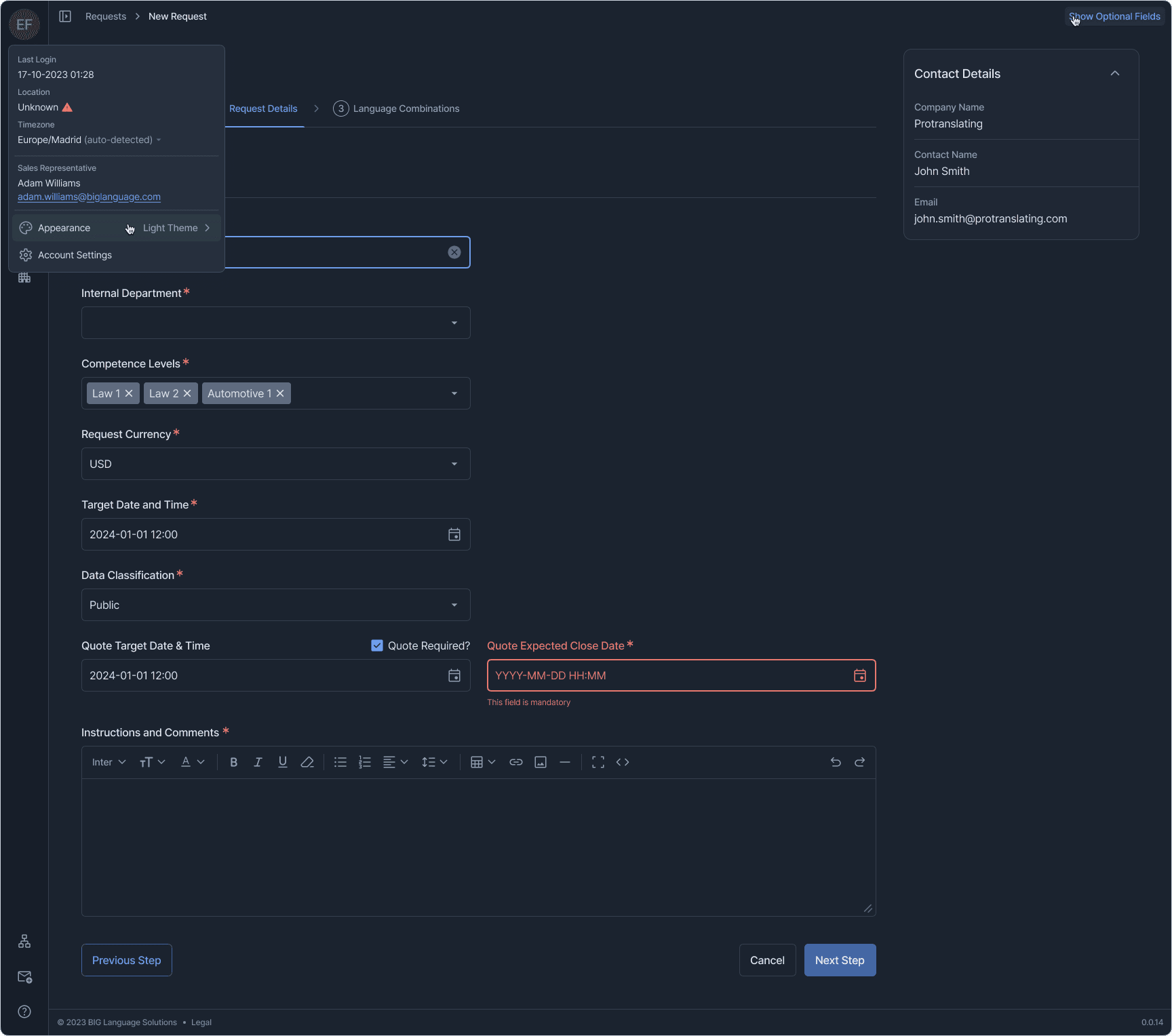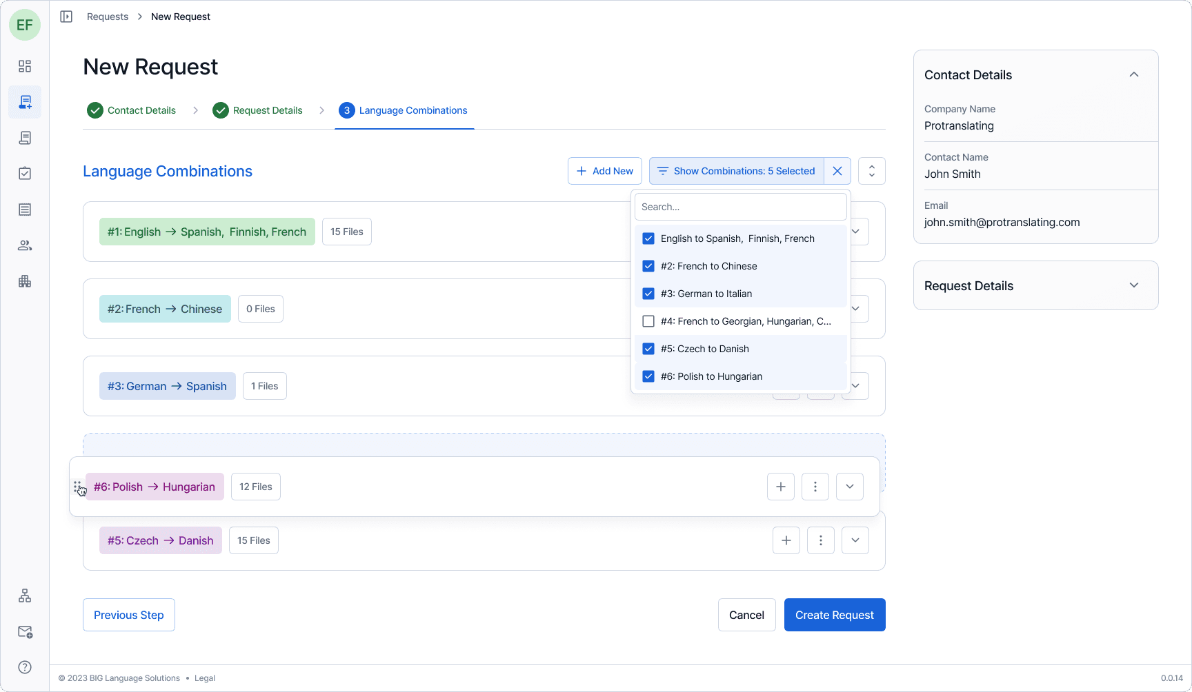 One example: translation requests can involve multiple language pairs, each with its own file set, metadata, and status. The new request flow uses a stepped wizard with a persistent context sidebar, language combinations that expand and collapse independently, inline file management, and bulk operations — all within a single coherent view. Every other section followed the same logic: surface what matters, let the user drill deeper on demand, never hide context