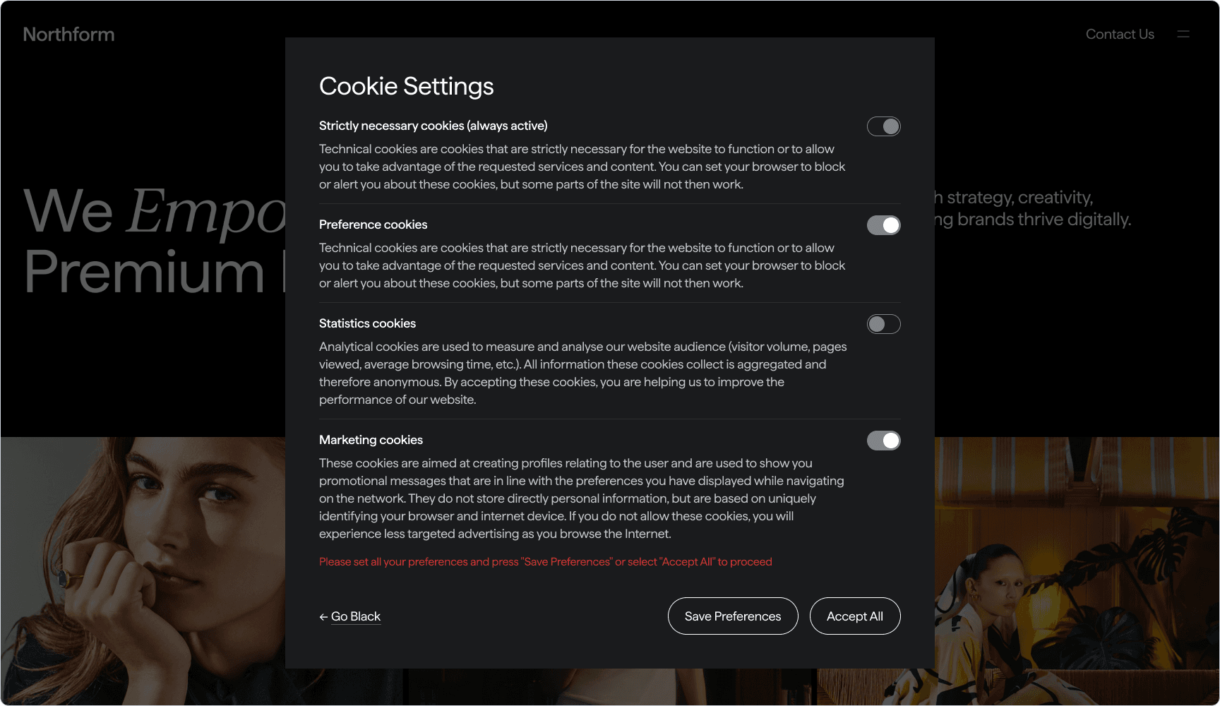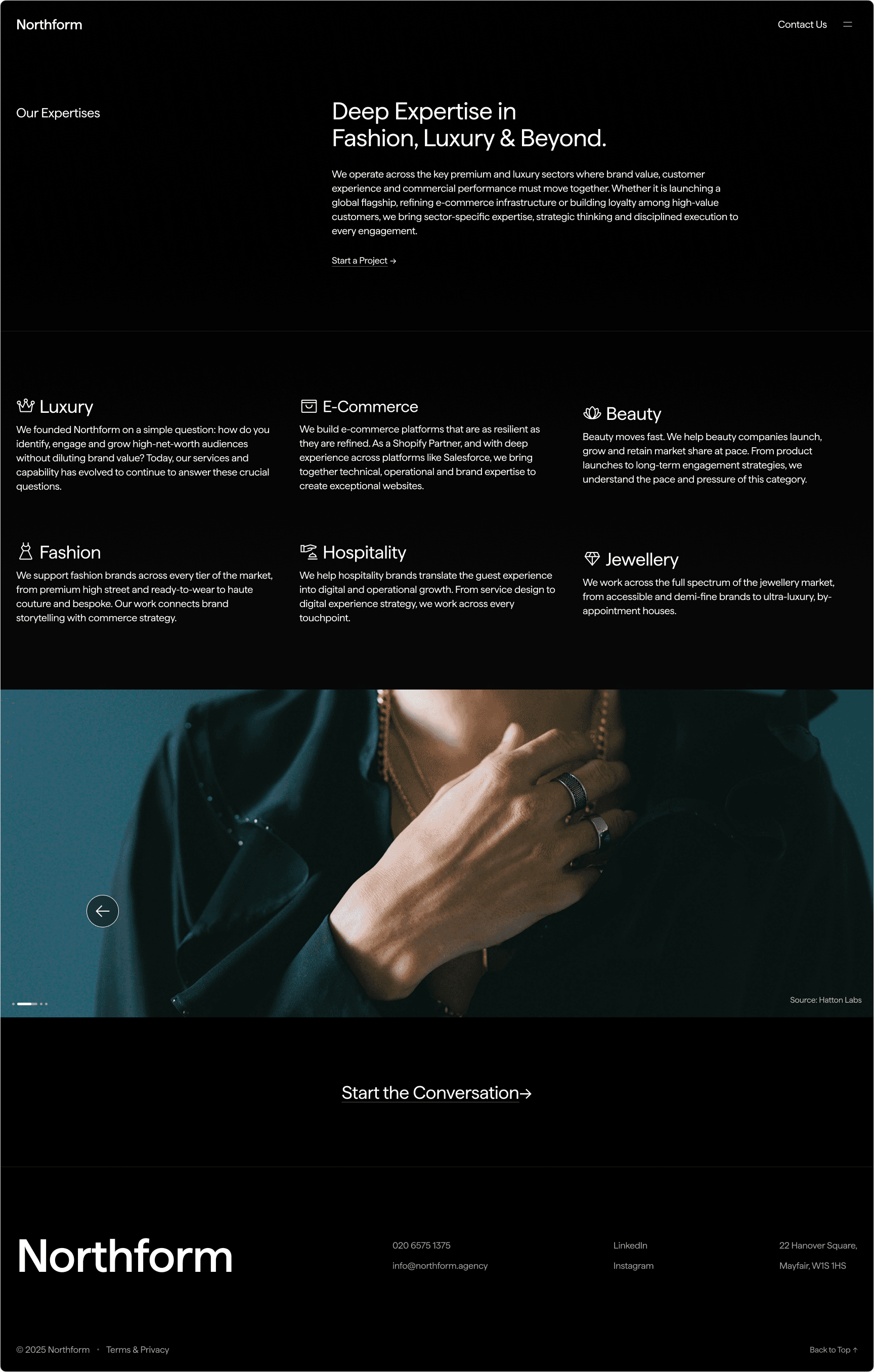 Three major sections were designed from zero. An Expertise page mapping the agency's verticals — Luxury, E-Commerce, Beauty, Fashion, Hospitality, Jewellery — giving each a clear positioning instead of a generic "we work with everyone." An Advisory product with tiered pricing, onboarding flow, and FAQ — turning a service offering into something that can sell itself on the page. And a full Journal system with editorial categories, article templates with section navigation, social sharing, and related content — giving the agency a content voice it never had.