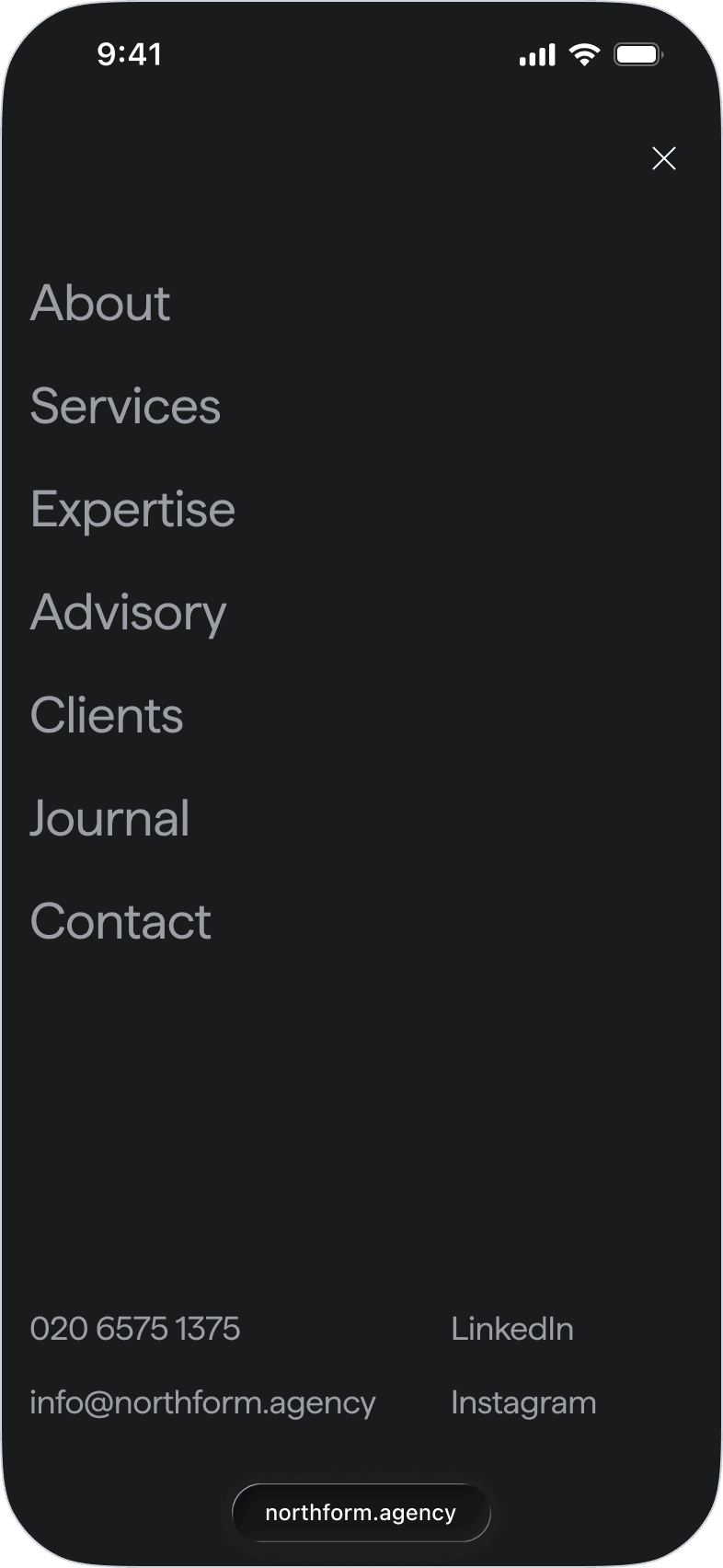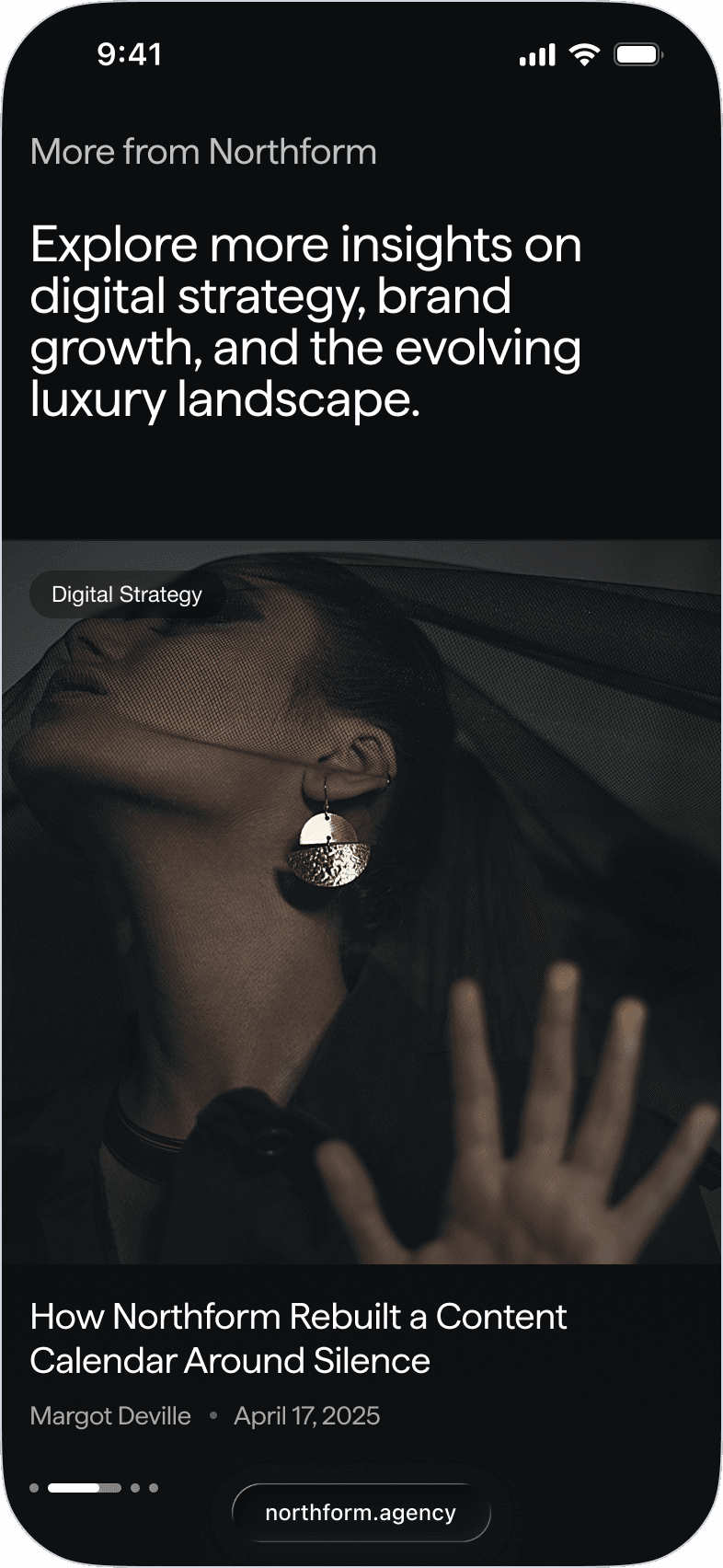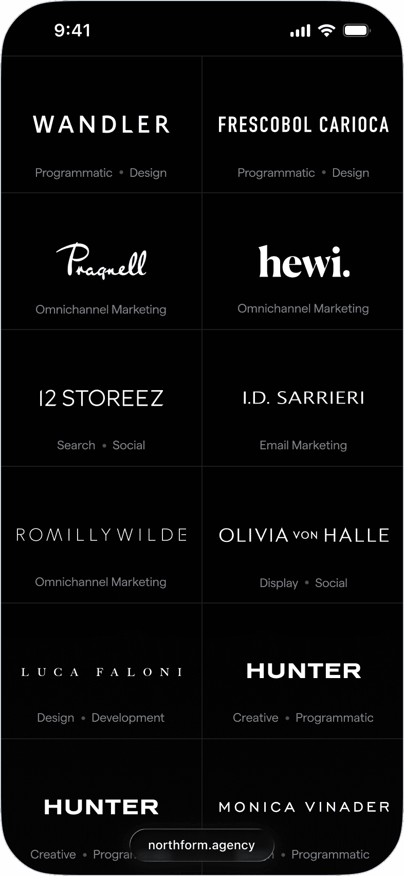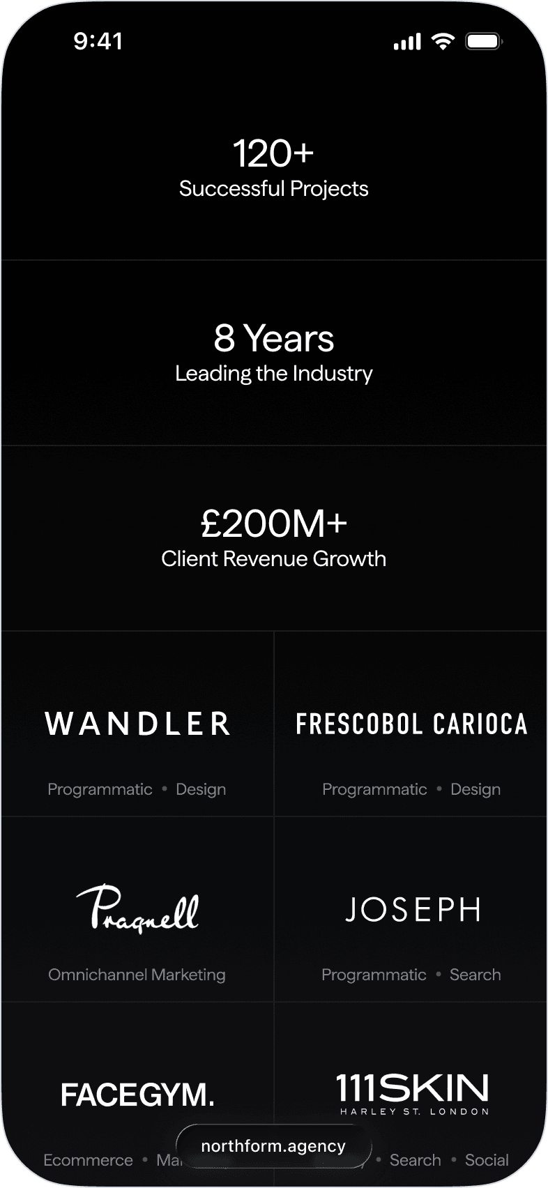 Northform is a digital agency working with premium and luxury brands — Wandler, Frescobol Carioca, Joseph, 111Skin, Aspinal of London, Molton Brown, DITA. The kind of clients who expect the agency's own presence to match the standard of the work it delivers for them.