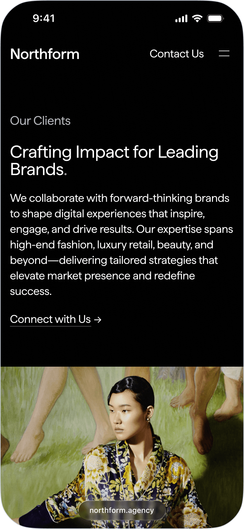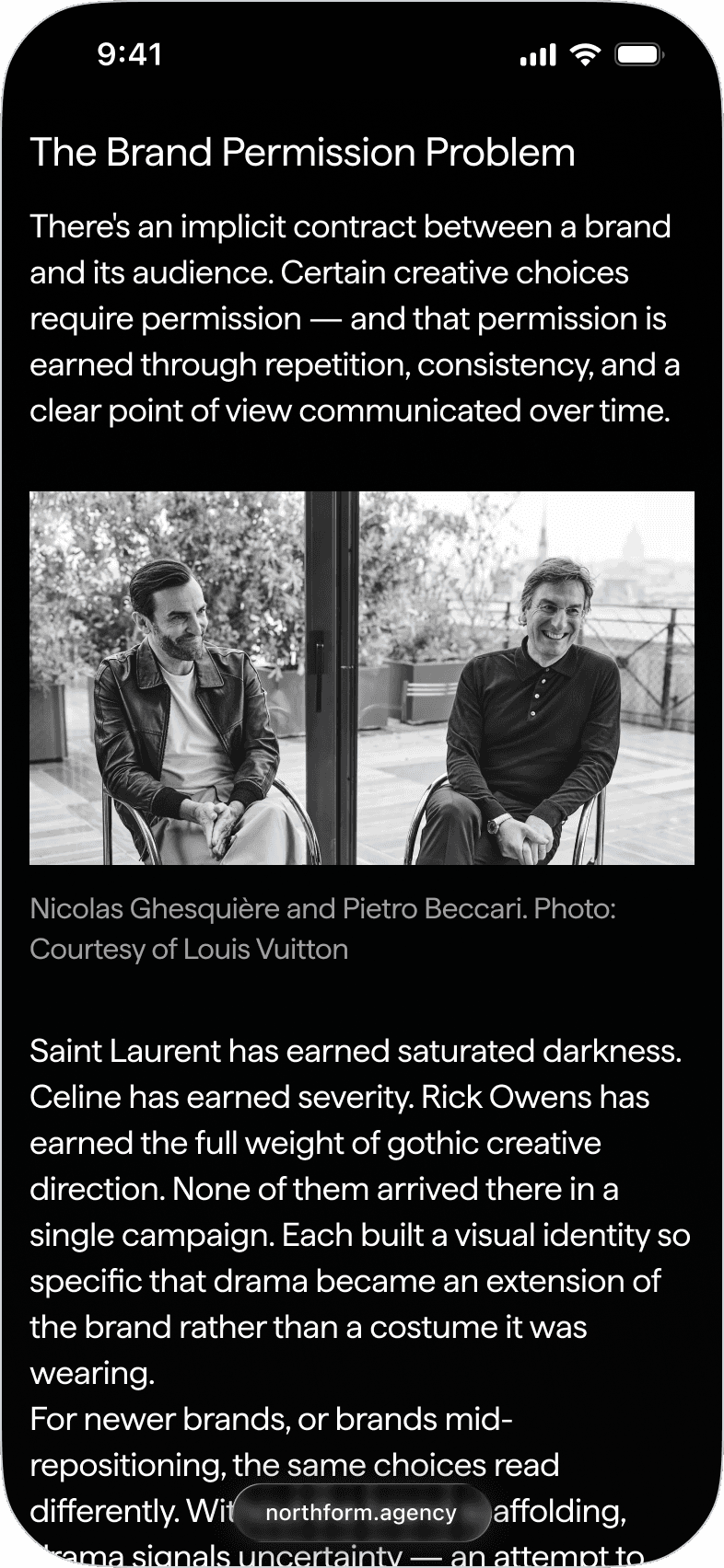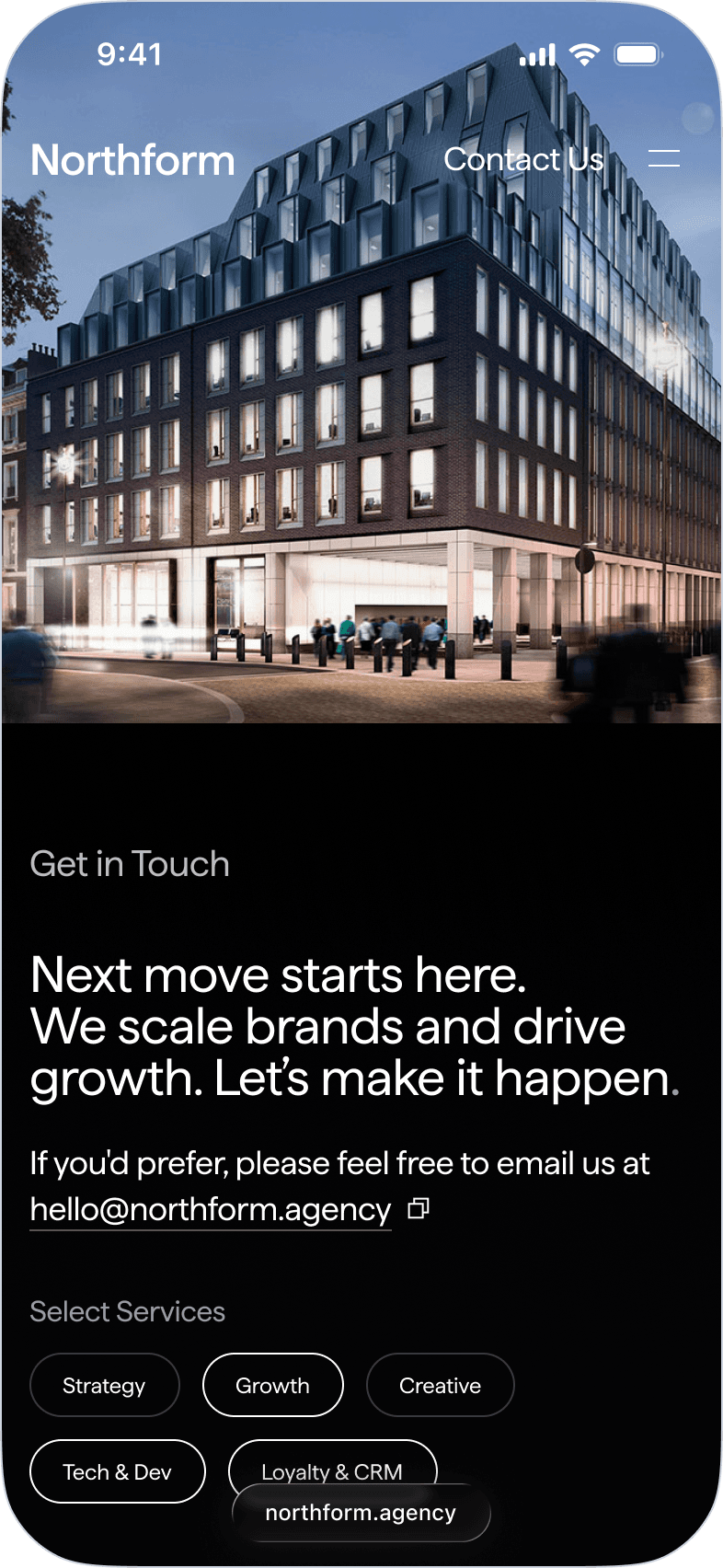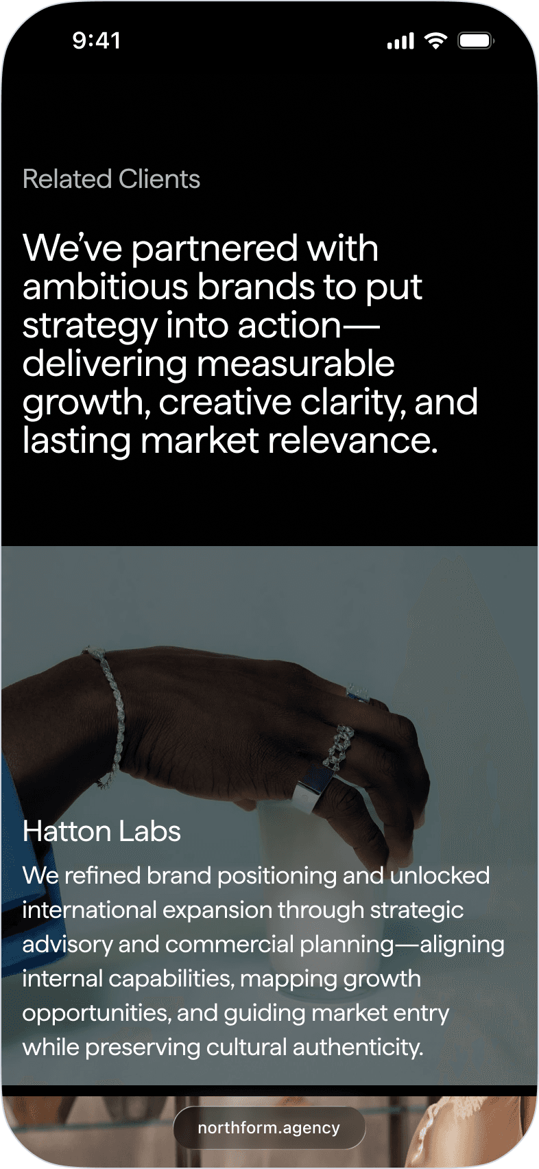 Northform is a digital agency working with premium and luxury brands — Wandler, Frescobol Carioca, Joseph, 111Skin, Aspinal of London, Molton Brown, DITA. The kind of clients who expect the agency's own presence to match the standard of the work it delivers for them.