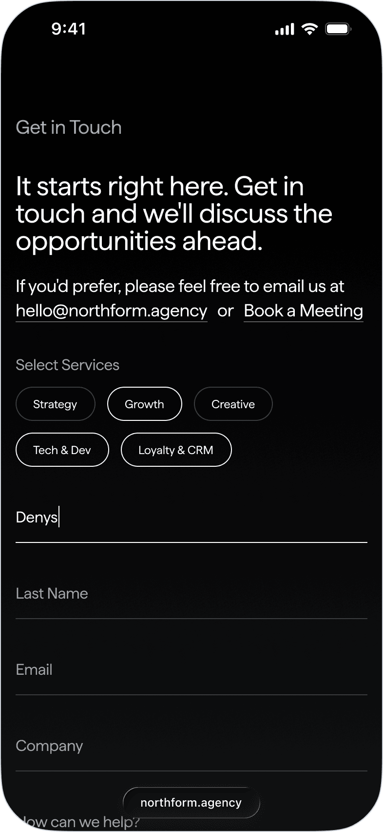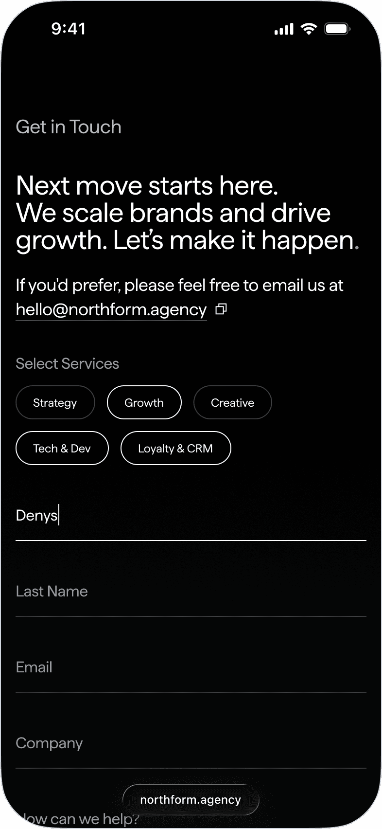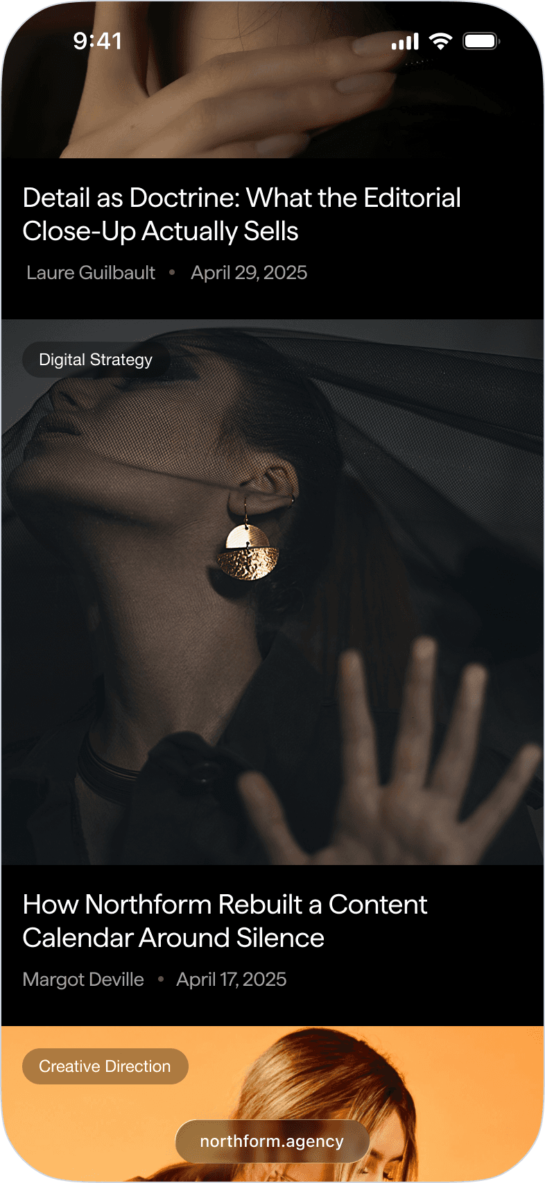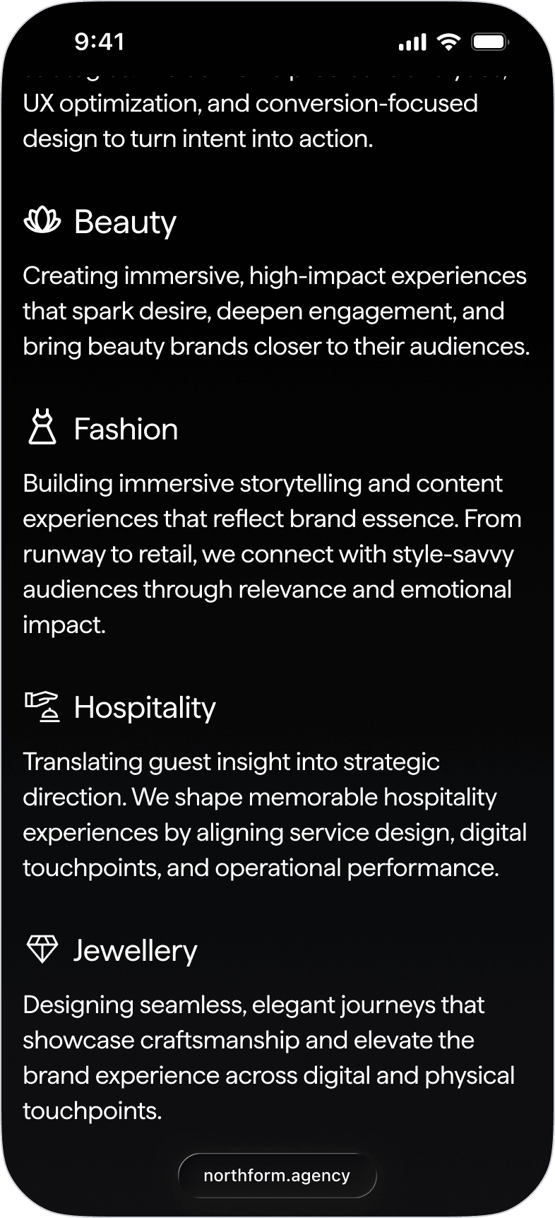 Northform is a digital agency working with premium and luxury brands — Wandler, Frescobol Carioca, Joseph, 111Skin, Aspinal of London, Molton Brown, DITA. The kind of clients who expect the agency's own presence to match the standard of the work it delivers for them.
