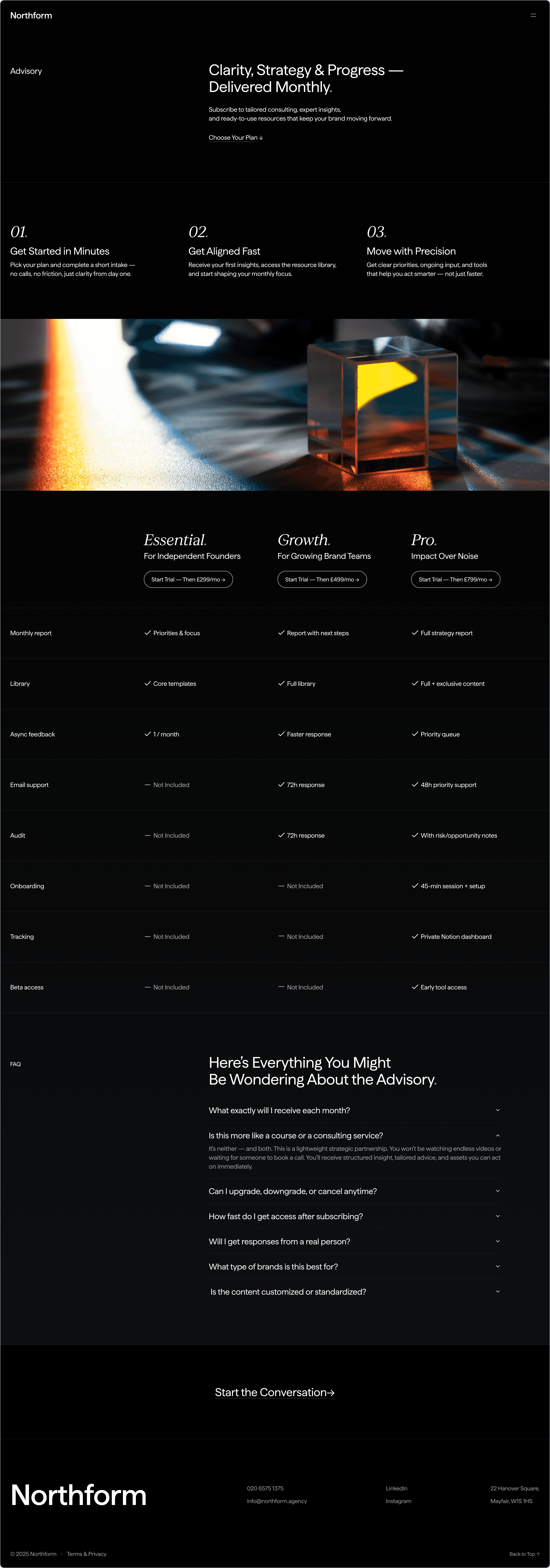 Three major sections were designed from zero. An Expertise page mapping the agency's verticals — Luxury, E-Commerce, Beauty, Fashion, Hospitality, Jewellery — giving each a clear positioning instead of a generic "we work with everyone." An Advisory product with tiered pricing, onboarding flow, and FAQ — turning a service offering into something that can sell itself on the page. And a full Journal system with editorial categories, article templates with section navigation, social sharing, and related content — giving the agency a content voice it never had.