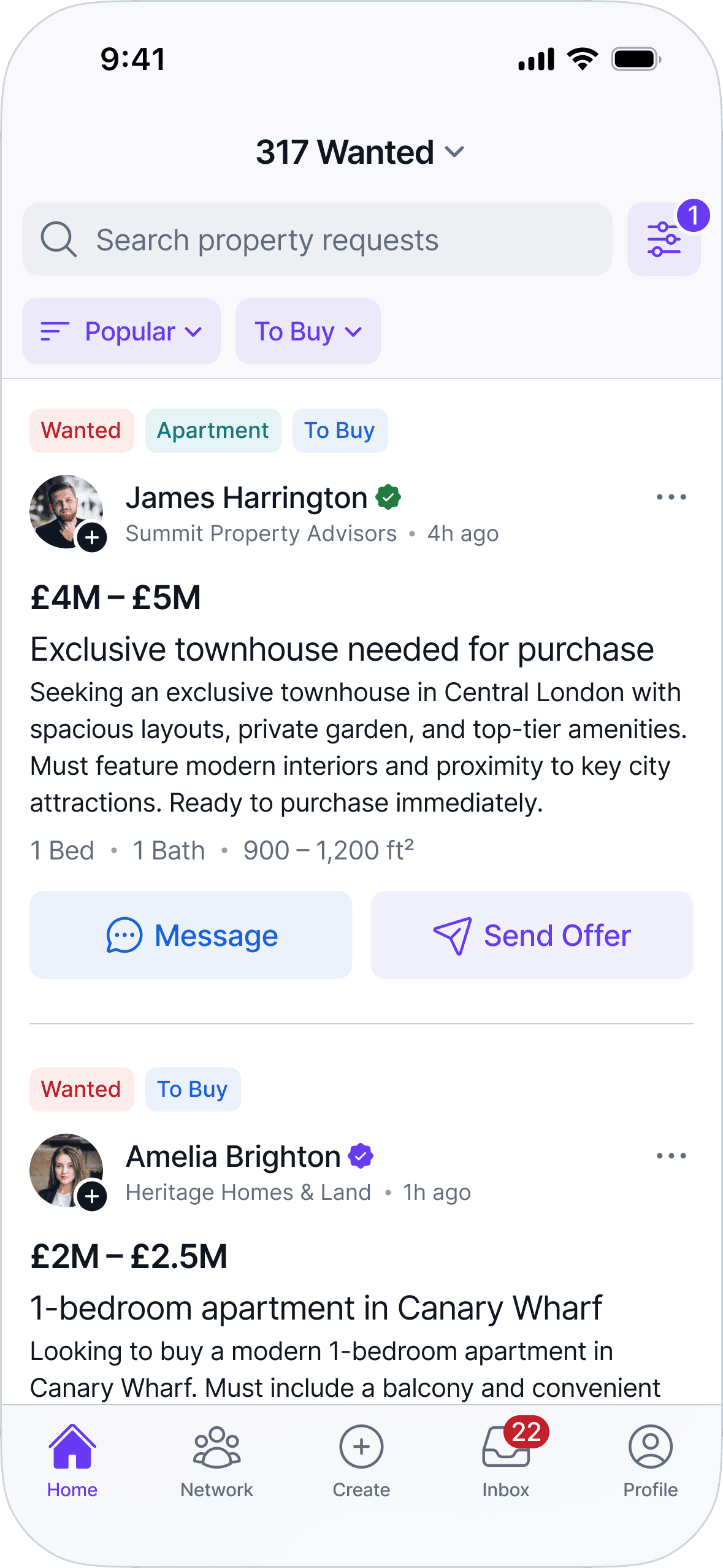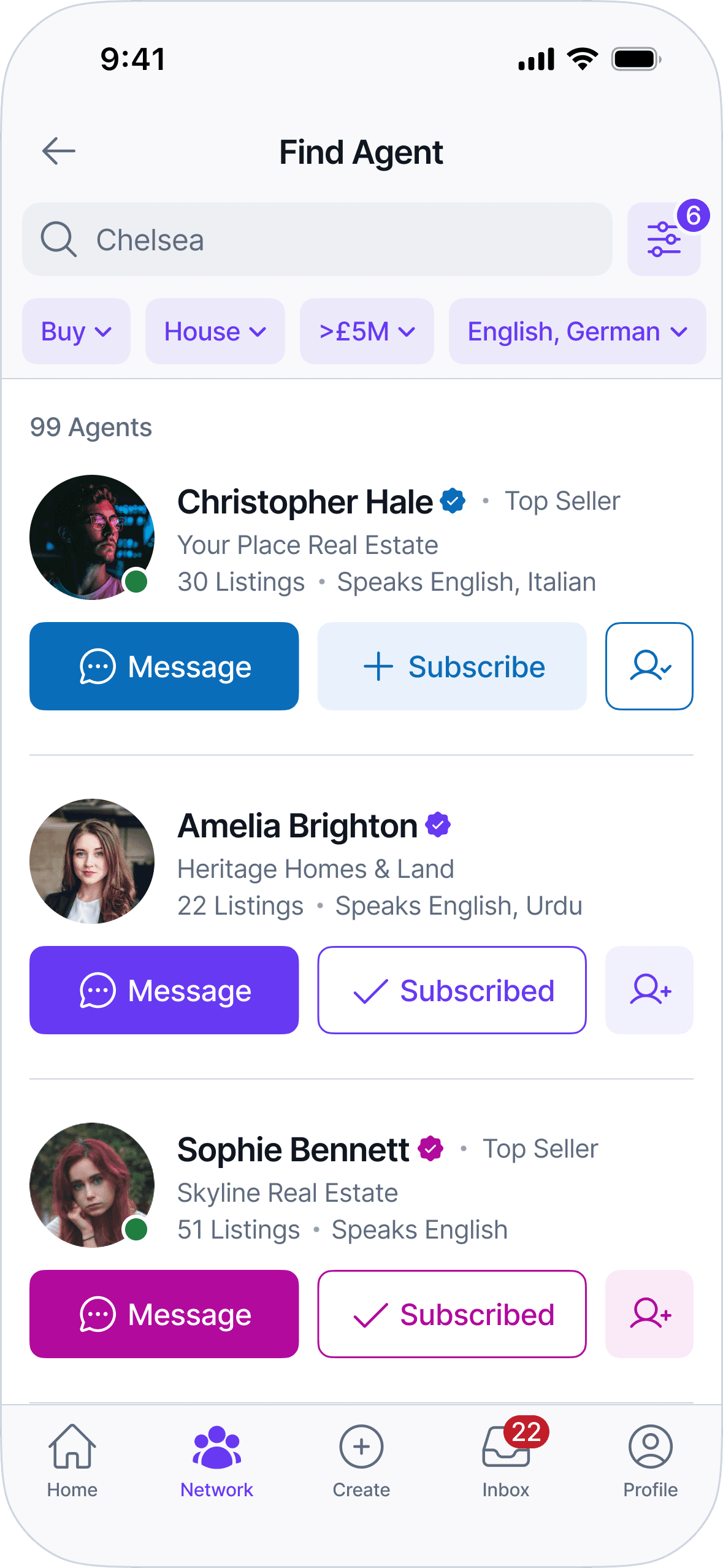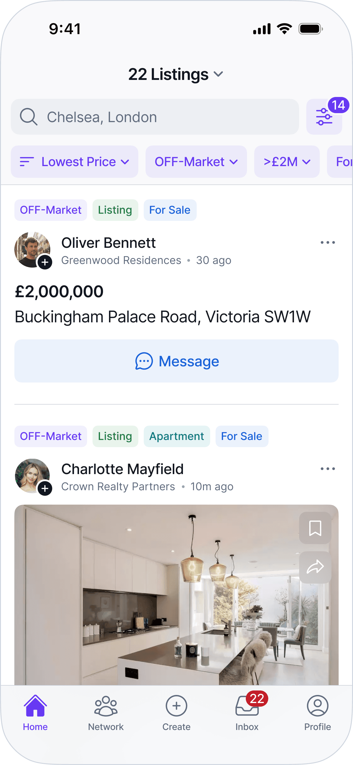 The UI prioritizes clarity, predictable patterns, and information density to support fast scanning and comparison. Layouts, navigation, and components are designed to scale across listings, profiles, messaging, and network interactions without introducing special cases
