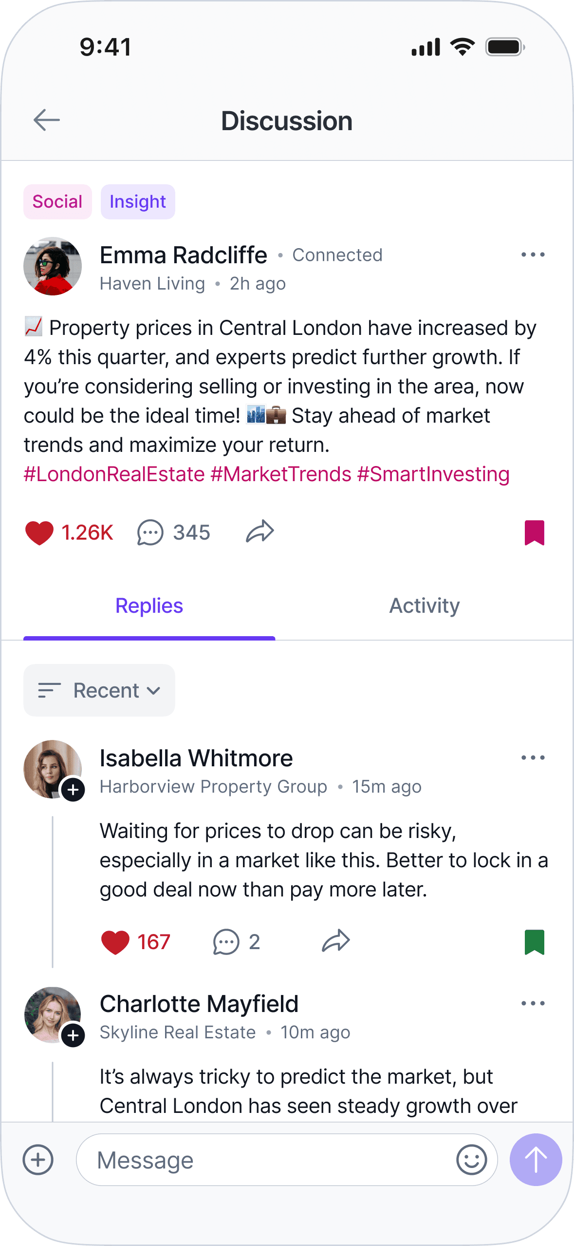 Social features exist only to support these workflows. They provide context and trust signals, but never compete with the primary goal: progressing real transactions efficiently